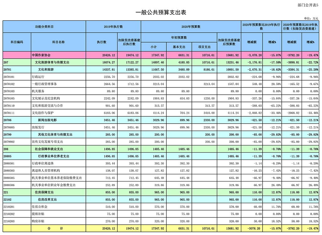 五、关于中国作家协会2020年一般公共预算支出表的说明
