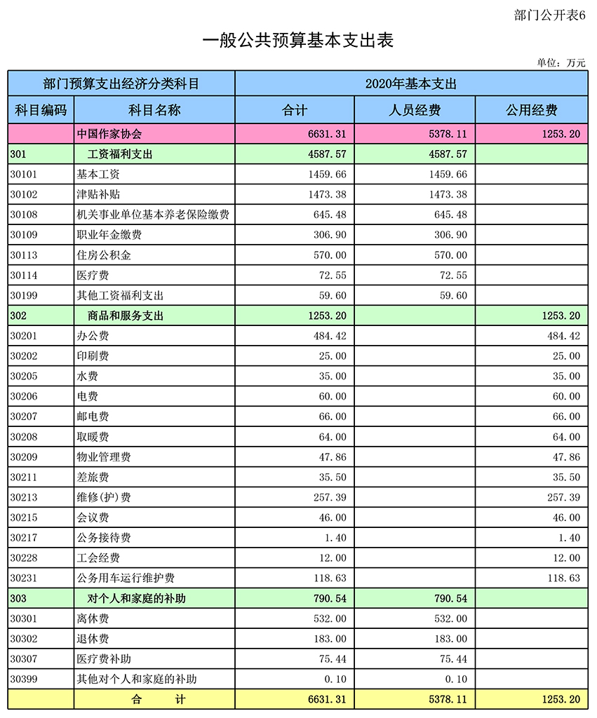 六、关于中国作家协会2020年一般公共预算基本支出表的说明