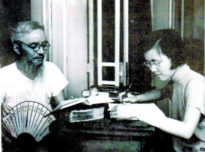 丰子恺在上海寓所日月楼与幼女丰一吟合译《源氏物语》