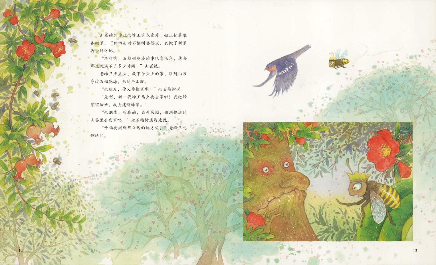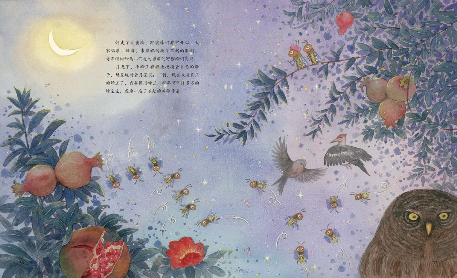 果园里的老石榴树特别希望野蜜蜂家族能搬迁到远方的山谷去安家,繁衍后代。因为她很清楚,野蜜蜂家族变成弱群的原因。老蜂王没有答应,她可不能在石榴树开花最需要授粉的时候离开果园。当年轻的蜂王诞生时,野蜜蜂家族遭遇了外敌大黄蜂的袭击。危难时刻,年轻有为的蜂王带领蜂群加紧训练后与大黄蜂斗智斗勇,最终打败敌人。在老蜂王的嘱托下,年轻蜂王带领新的蜂群飞向山谷……