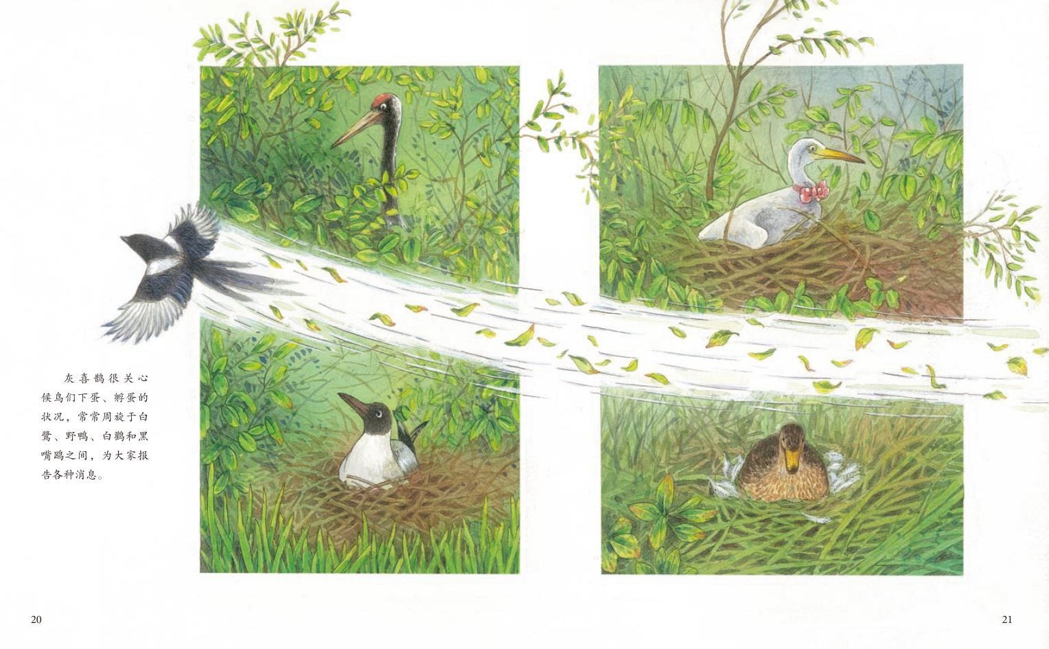 迎春花刚刚含苞待放,老白鹭早早地带着一百多只白鹭,浩浩荡荡地进入了鸟类栖息地——大海口湿地。这片湿地始终是白鹭、绿头野鸭、黑嘴鸥和白鹳鸟们生儿育女的摇篮。尽管湿地的空气越来越臭,水越来越脏,食物越来越难吃,苇子荡、槐树林、湿草甸萎缩得越来越小,但是夏候鸟们仍一如既往地回到这里筑巢、生蛋、哺育雏鸟。意外发生了,鸟儿们下的蛋都很奇怪,根本无法孵化出来,最终,大家越过了熟悉的故乡,去远方寻找新的栖息地……