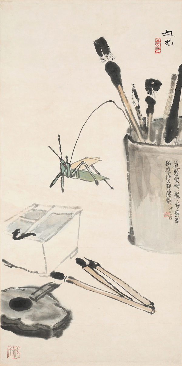关良所走的艺术道路,则可谓介于谢之光与林风眠之间,他是将“笔墨”从文人画规范中解放出来,迈向更加广阔的点、线面“有意味的形式”。关良早年留学日本,深受西方现代派艺术影响,他的艺术是从西方、东洋以及中国传统绘画中幻化而来的。自上世纪40年代起,关良的戏曲画开始独树一帜。刘海粟认为“他的人物、风景,不论国画、油画,气韵生动,全是中国派头,传导的是中国人的感情趣味,举重若轻;篇幅虽小,内容宏大,从容不迫。我把它们都看做中国画,中国人画的画。他画的是动作中的人,有思想感情,彼此呼应。少到一个角色,也有一台人气,半点不空,填满了活气,或叫戏的气流。连个武行(打手)龙套全进了戏,与主角交流。不拘泥,不生造,怎么画都耐看,有回味。”欣赏之余,刘海粟还与关良有过合作,如此次展出的《西游记之一》。