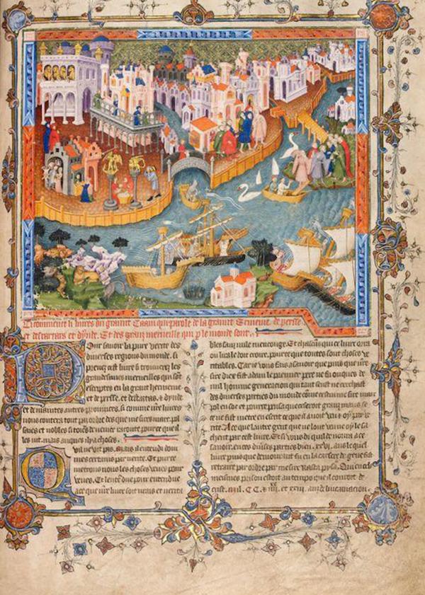 事实和虚构在《游记》中错杂交汇。1271年,波罗和父亲、叔叔一起穿越丝绸之路抵达了亚洲。在那之后,他在异国的行旅延续了许多年,在彼时统治中国的蒙古皇帝忽必烈汗麾下担当要职。1295年,他终于返回威尼斯,带回故国的并没有多少珍宝,却有数不尽的故事。那些故事或许本来会被他带进坟墓的,然而1298年,当威尼斯和热那亚爆发冲突时,波罗卷入其中,被关在热那亚监狱。在那里,他遇到了来自比萨的鲁斯蒂切罗(Rustichello da Pisa),一位浪漫主义作家。鲁斯蒂切罗慧眼识珠,敏锐地意识到波罗的故事有多么精彩,便说服了波罗把回忆录口述给自己。鲁斯蒂切罗用法语记录下波罗的故事,起名为《世界奇闻录》(Livre des Merveilles du Monde)。这本书的手抄本风靡一时——印刷术还要再过一百五十年才会诞生——并早在1302年就被翻译成了拉丁文。在这本十五世纪手抄本的卷首插图上,我们能看到波罗正于威尼斯启程,他的船队就停泊在总督府和圣马可大教堂前面: