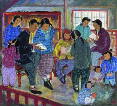 1950年代起,林风眠开始创作以人物组群为主体的现实生活题材绘画,此次展出的《渔妇》《农妇》 《菜农》《读书声》都是例证。有意思的是,即便表现的劳动题材与林风眠此前擅长的仕女等题材迥异,画家的艺术风格依旧在画中清晰可见,例如他偏爱的浓烈色彩、浑圆造型、浓厚墨线以及抒情性的东方情调。就连特立独行的关良也画过现实题材。此次展览中有一幅他画于1960年代的《阿尔巴尼亚舞蹈图》,是他受当时阿尔巴尼亚歌舞团访华的影响而创作的,与其一贯秉承的开放的创作心态不无关联。作品构图布局、表现技法颇似关良标志性的戏画,人物衣饰却传神地表明这是五位来自异域的舞者,体现出相当的艺术高度。