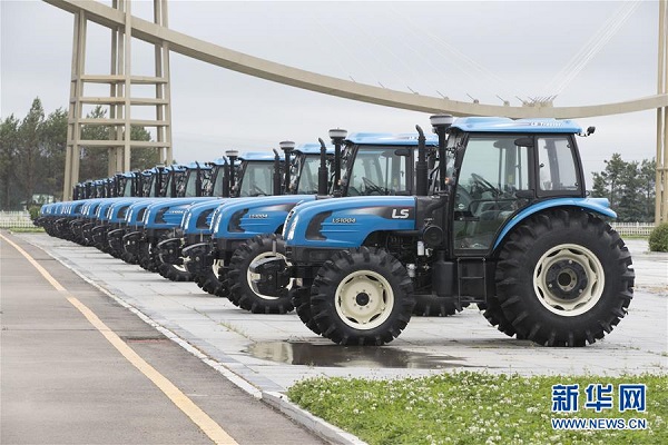 在北大荒精准农业农机中心广场上展示的大型农机(6月15日摄)。新华社发(张涛 摄)