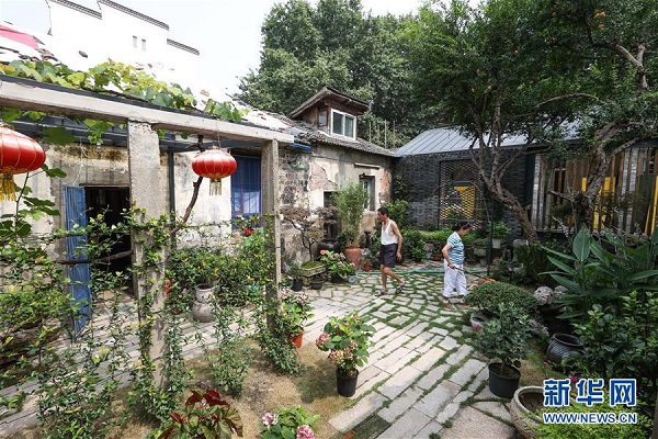 堆草巷居民刘光纪(左)与老伴在“共享院落”里整理花木(7月1日摄)。他们把自家接近100平方米的后院对外开放,成为公共开放空间。新华社记者 杨磊 摄