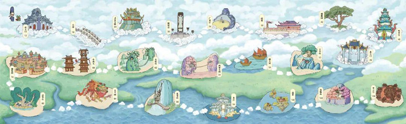 这本书大致按照“天界”、“人界” 、“地界”三部分的图景划分,一共是22处西游景点,三个空间独立却又承前启后,极其详尽。比如天界的相关介绍,南天门、凌霄宝殿、广寒宫这些地点西游迷们也不陌生,但是四大天王的法器和能力,天河中的珍奇神兽,《霓裳羽衣曲》的来历大家却未必清楚。数百位神话人物,恢弘壮丽的神话场景,是“西游”却又非“西游”。通过对古典名著的再创作,不仅精准还原了原书中的故事,又进行了合理的升格。