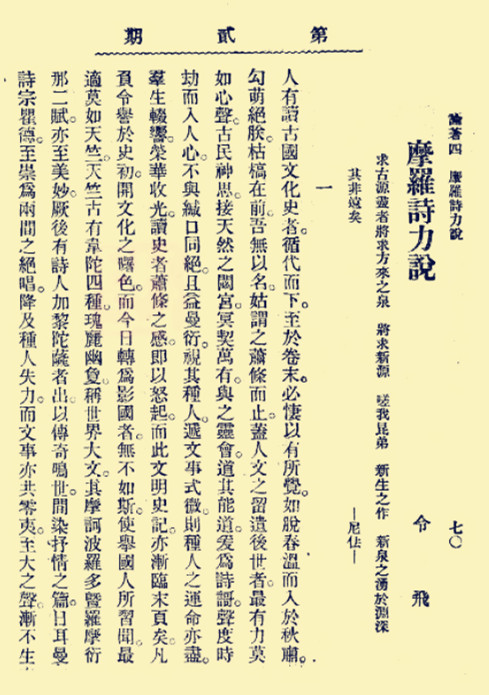 发表于《河南》杂志1908年第2期的《摩罗诗力说》,署名令飞
