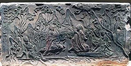 写为“南山四皓”(图左边沿)的南朝画像砖