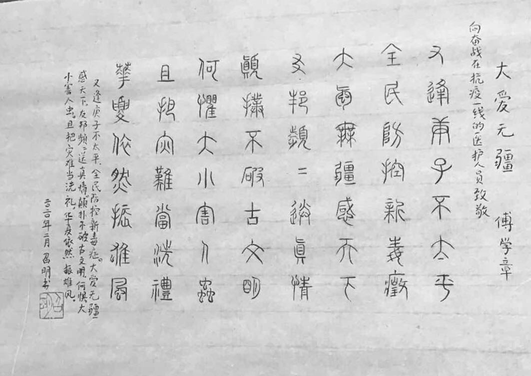 庚子年,是一个不平凡的年份。新冠肺炎疫情暴发后,中国作协广大老同志非常关心疫情防控进展,十分牵挂在一线抗击疫情的医护人员的安危。老同志们由于年龄、身体等原因无法参与一线抗疫工作,但他们始终心系国家、社会,始终情牵疫区人民,他们响应党中央号召,努力配合做好个人防护工作;并发挥自己所长,以书画的方式表达对党和政府抗疫工作的坚定支持,以及对广大抗疫工作者的讴歌赞美,诠释了共产党员的初心和使命。