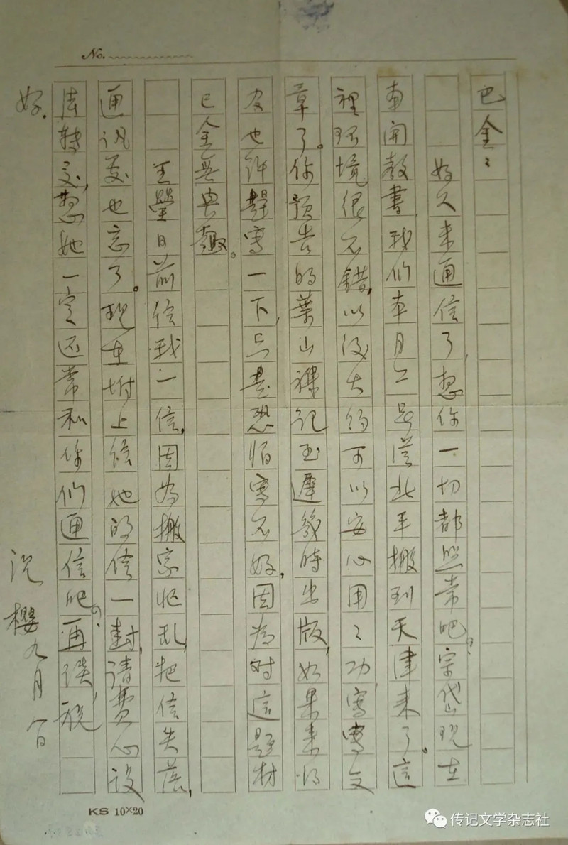 [2] 沉樱1934年8月19日致巴金信,上海巴金文学研究会整理:《写给巴金》,大象出版社2008年4月版,第127页。