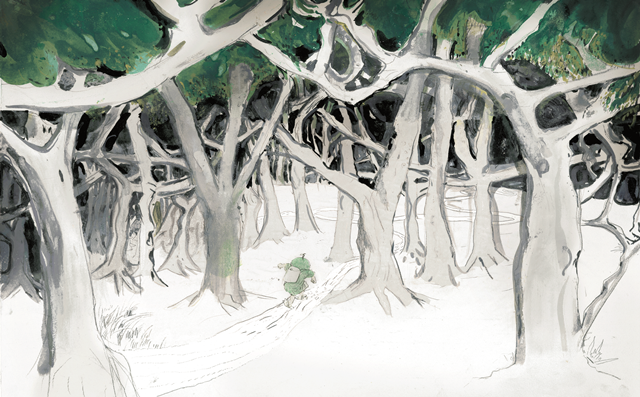 记者:在您的创作中还能发现一些由来已久的设定,似乎构成了您绘本世界中独有的风景,比如《游侠小木客》中,参加木客村新生仪式的队伍中出现了早前作品中的主角“梅雨怪”“屠龙族”等身影,在这个充满象征性的场合再现这些过去作品中的经典角色是出于什么考虑?您对于自己绘本世界的构筑有怎样的野心和期待?