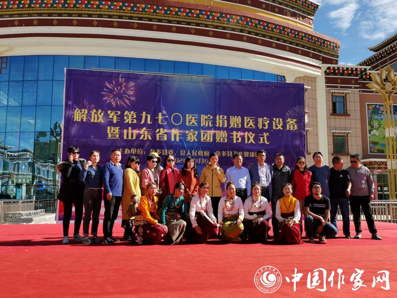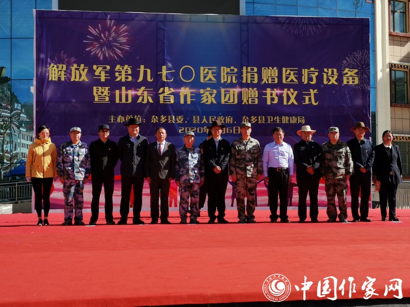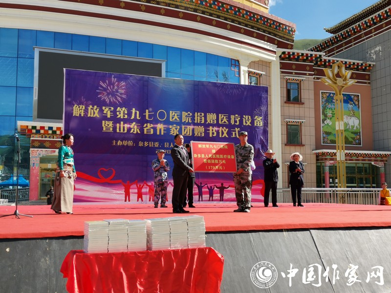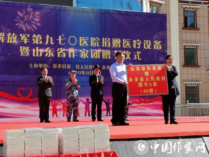 8月6日上午,“解放军第970医院医疗设备捐赠及山东省作家团赠书仪式”在杂多县文化广场上举行。山东作家们以“守护希望、筑梦未来”为宗旨,为杂多县的孩子们赠送了一批图书。葛长伟在致辞中表示:“此次携作家团来到美丽的澜沧江源头,将以民族情感为纽带,用文字铭刻澜沧文化,为杂多的蓬勃发展贡献力量。”仪式上,杂多县向山东省作协回赠锦旗:“巍巍泰山情系雪域高原 澜沧江源笔绘脱贫攻坚”。