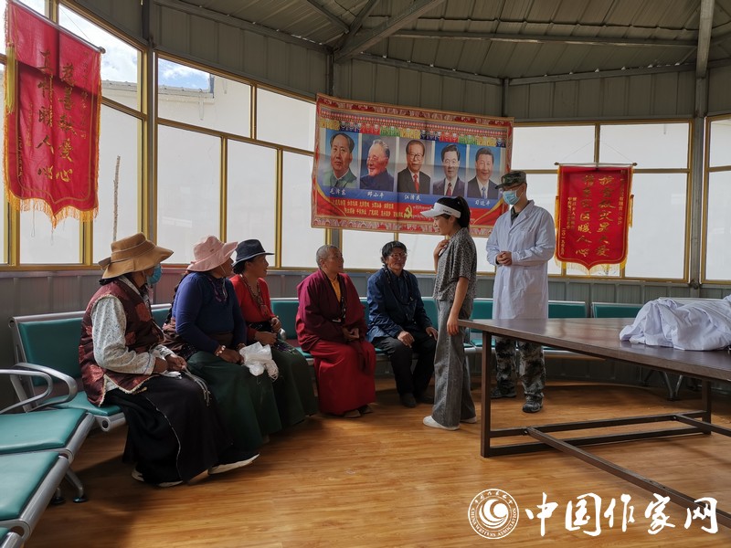 当天下午,山东省作家团与第970医院援青医疗队共同前往杂多县岗日麻贝敬老院进行巡诊。由于大多数藏民不会说汉语,沟通困难,懂汉语的年轻人需要帮助医疗队做翻译,作家团只能通过简单的汉语配着手势与老一辈的藏民们沟通。养老院没有专用的卫生室,医疗队骨科专家军医李亮只能在室外给藏民们看病。围在他周围的作家们,听到他对藏民们说的最多的话就是:“抓紧时间去医院拍片子、做检查,去县医院找我,进一步确诊病情。”藏民看病的队伍排成了长龙,军医们对症下药,为患者赠送药物并嘱咐他们按时按量服用。而藏民们对医疗队的到来也表示非常感谢。
