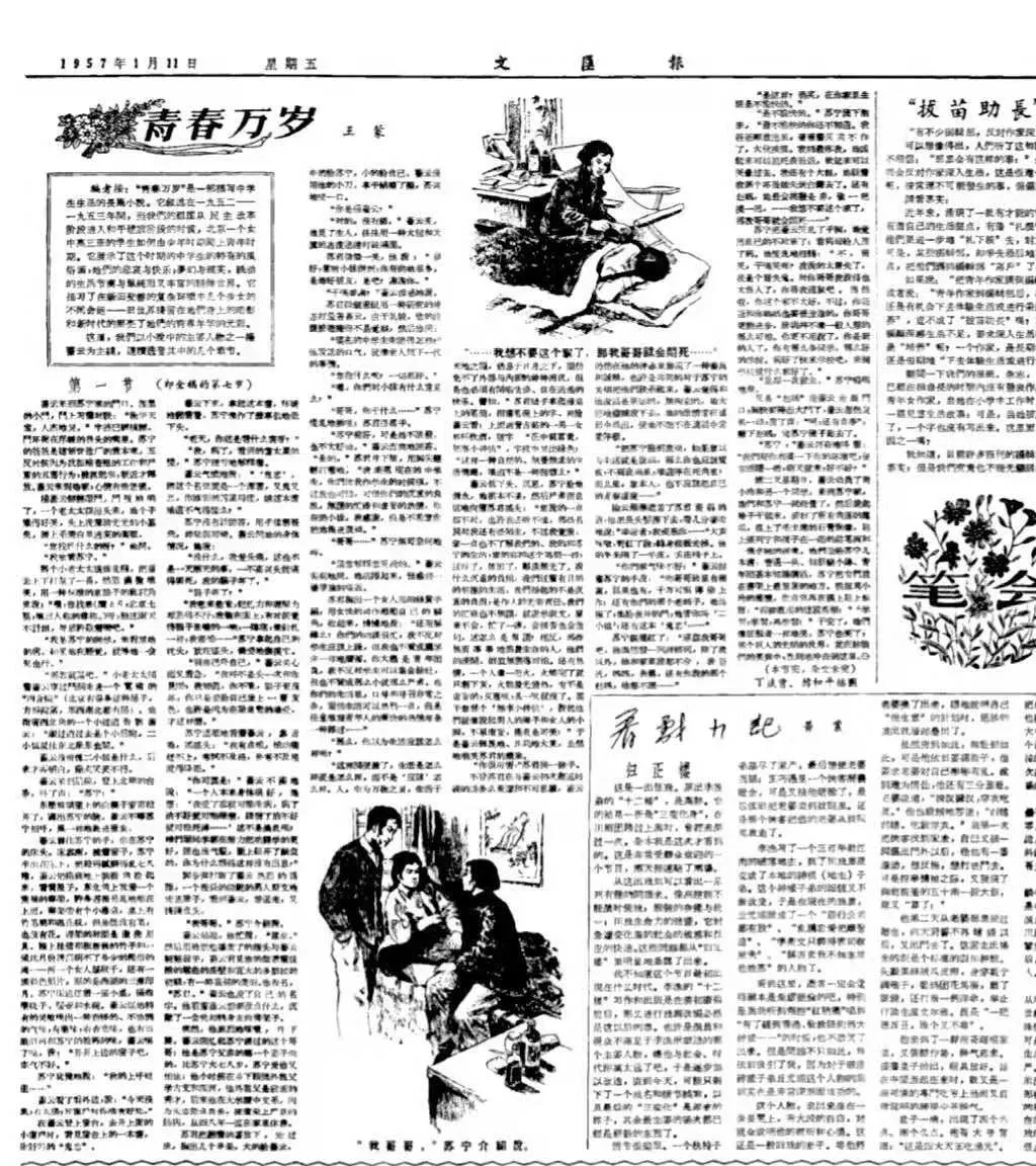 《青春万岁》的主要版本有如下三个:1957年1月11日至2月18日在《文汇报》分29期连载了小说全篇近三分之一章节;1979年5月人民文学出版社出版单行本(该版本经历了1962年与1978年两次改动);1998年6月人民文学出版社再版时,王蒙在1979年初版本基础上,对小说部分章节按1957年《文汇报》连载版做了恢复与修改,此后各版基本以此为蓝本。总体而言,诞生于“百花时代”的连载本保留了迷茫、忧郁等复杂的内心感受及个人的情感表达;而1979年的初版本有诸多对于禁忌的规避,删削了上述内容,属于“十七年文学”余脉的“洁本”;1998年的再版可视作该小说的“定本”[11]。本文主要依据此定本,个别地方出于论述需要,将对版本变异作出说明。