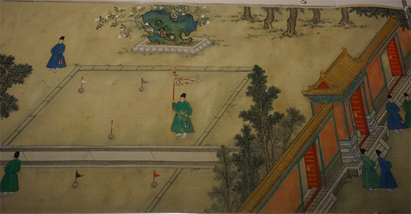 乾东五所与乾西五所,在明代是供地位较高的宫女居住的地方。明代宫女中未能升为嫔妃,但资格较老、地位较高者,得以居住在乾东或乾西五所。皇帝的乳母,是最高等级的宫廷女佣,例行居住在这一带。乾东、乾西五所,明清两朝也常有公主居住,清代也曾成为皇子的居所。现场也展出了多幅描绘明代的皇帝在后宫中生活场景的绘画,明代宫廷绘画中有一类表现帝王生活和重大历史事件的作品。《朱瞻基行乐图》描绘的就是明宣宗朱瞻基便服簷帽在御园观赏各种体育竞技表演的场面。包括射箭、蹴踘、马球、捶丸、投壶等,场面宏大繁复而又具体入微,生动地表现出当时宫中的文体娱乐活动。由于要反映特定的地点和环境,所以描绘了大量的建筑。此卷以工整细腻的写实手法按照历史原貌对明代皇宫的楼台殿阁作了既真实又概括的描绘,是研究明代宫廷历史以及皇家建筑的重要资料。