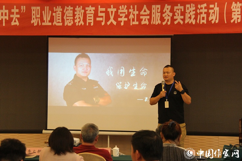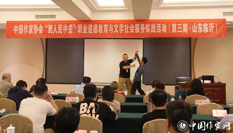9月12日,第三期中国作协“到人民中去”职业道德教育与文学社会服务实践活动在山东临沂举行。活动中,北京市特警、公安部大练兵个人标兵孔芃为来自中国作协文学工作者职业道德委员会的代表及宁夏、河北、陕西、山西、甘肃、福建、浙江等地60余名作家、文学工作者做英雄事迹报告会。在3个小时的报告会中,作家们认真聆听孔芃讲述的在面对各类暴力犯罪、紧急治安事件时惊心动魄的特警故事,为其“用生命保护生命”的英雄主义情怀所折服,为其“危难至 不彷徨”的精神所感动。