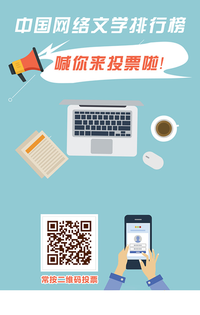 为体现网络文学的传播特征和市场特征,充分发挥广大网络读者在网络文学创作和传播中的能动性,本次评审特别增加了读者网络投票环节,在中国作家网微信公众号开设投票端口,于9月14日12点正式上线。读者可进入“中国作家网”公众号首页,点击底部菜单,选择“投票通道”,进入《排行榜喊你来投票啦》,扫描二维码即可进入投票页面。投票截止时间为9月28日8时。