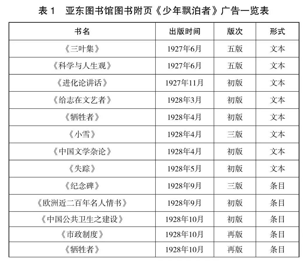 综上所述,亚东图书馆把握读者心理特点,新书出版时在《民国日报》上的集中广告,此后转为《申报》的周期性广告,加上持续不断的图书附页及《亚东图书馆书目》广告,形成了有侧重点而又覆盖全时间段的《少年飘泊者》广告投放策略,取得了强大的宣传效应。