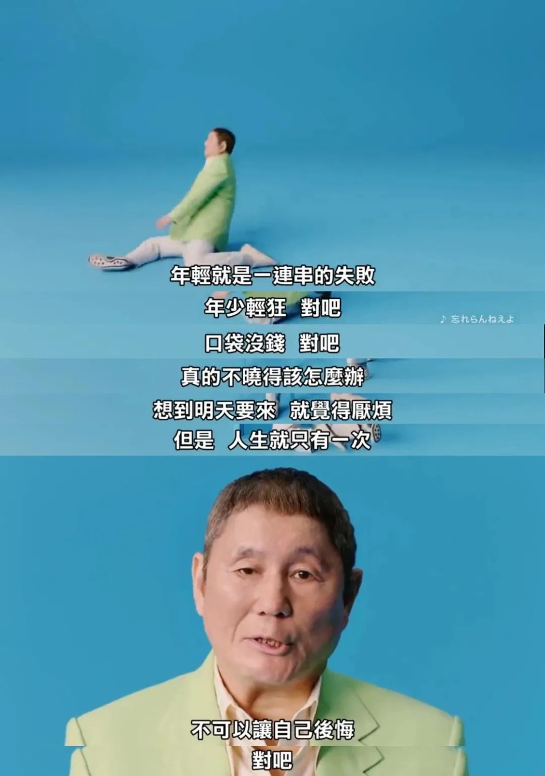 北野武今年73岁了,然而人们很难将这个集导演、演员、歌手、主持人、电影剪辑师、编剧、作家、诗人、画家等多重身份于一身的传奇人物,与“年老”这样的词联系起来。“人生过得是否精彩,取决于你对自己的评价。如果自己觉得人生过得有意思,那即便是身无分文,只要有地方住,有饭吃,能做自己喜欢的事情生活下去,这样也就足够了。” 折腾而滚烫,就是北野武的人生。