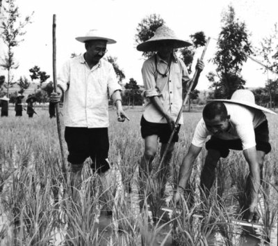 柳青(左一)与《创业史》主人公梁生宝的原型王家斌(右一)在稻田劳动