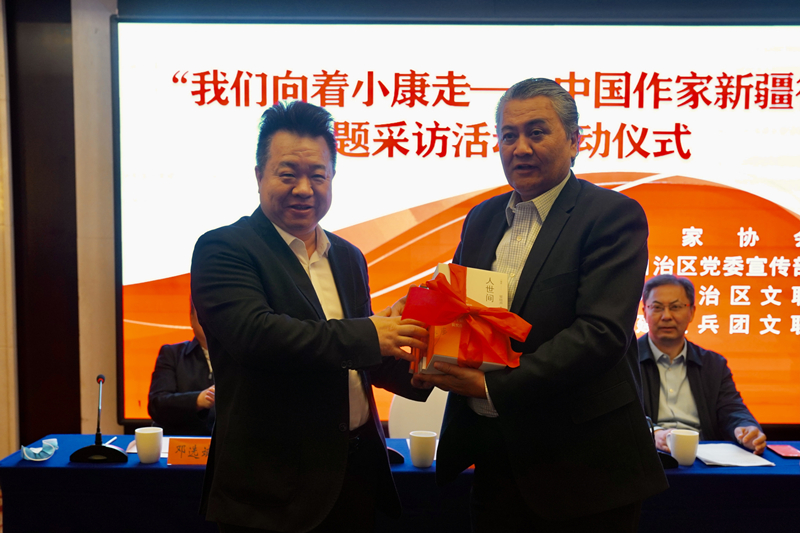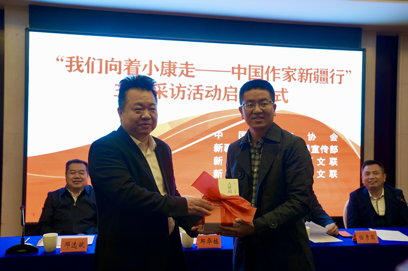 启动仪式上,邱华栋代表采访团向新疆维吾尔自治区党委宣传部赠送“第十届茅盾文学奖”作家签名书