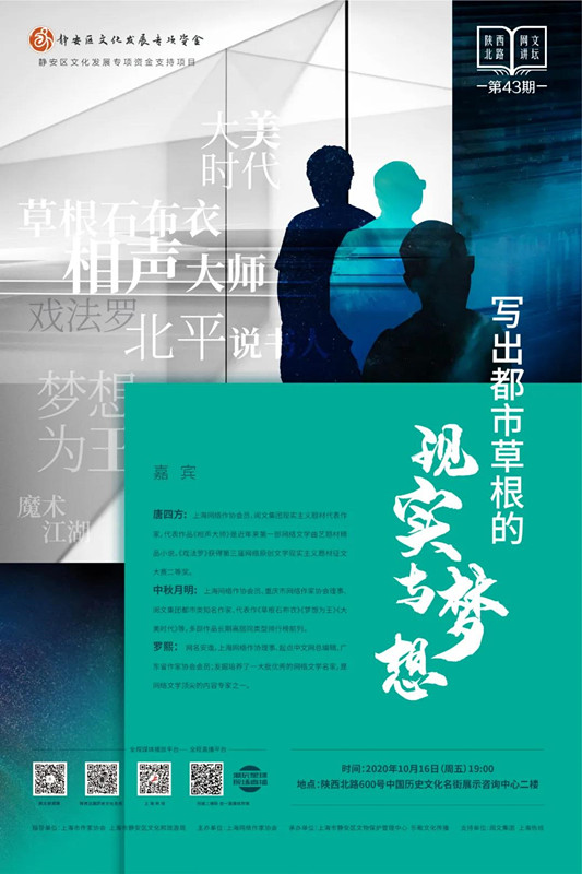 近几年来现实主义题材网文作品影响日益强大,口碑、销量俱佳的网络小说改变了人们印象中网络文学只是“言情穿越升级打怪”的文字,由于绝大多数网络作家都是在工作之余写作,他们笔下的现实生活反而更丰富多彩、更有质感。本期陕西北路网文讲坛邀请的两位嘉宾唐四方、中秋月明便是这类写作的代表作家,作品《相声大师》《戏法罗》(唐四方)、《草根石布衣》《梦想为王》《大美时代》《我只想自力更生》(中秋月明)都在平台有很高的阅读量,《相声大师》《草根石布衣》入选了国家图书馆永久收藏的100部网络小说。