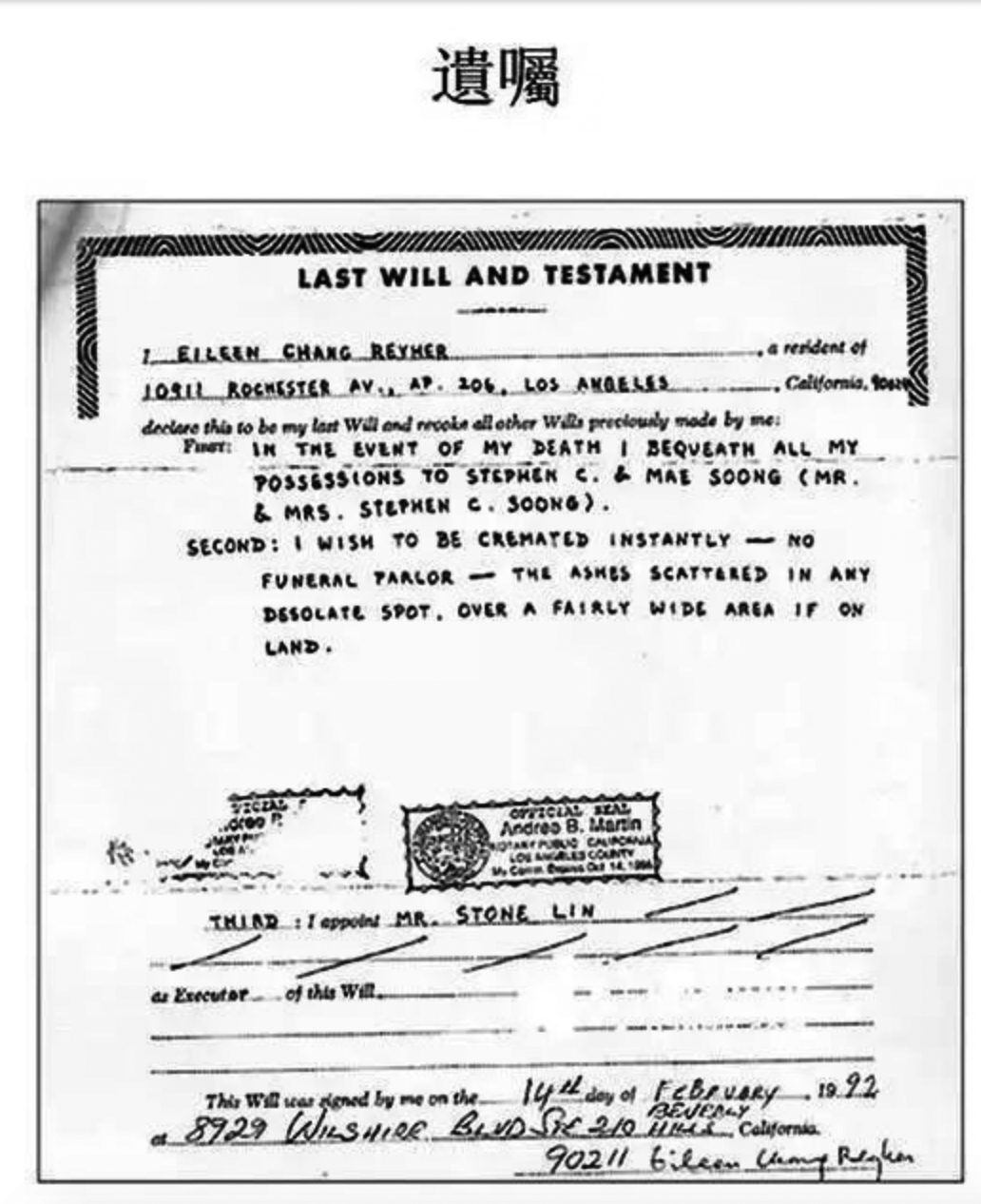 公证人确认:“EILEEN CHANG REYHER 在签署遗嘱时心智健全,而且不是被迫,也没有受到威胁、欺诈和任何人的不当影响。”即给这份遗嘱签了字。签完这份遗嘱后,她给林式同写信,附上遗嘱影印件,说了这件事,林式同还以为她得了什么不治之症,打电话问她,她说身体尚好,只是以防万一[15]。24日签下的遗嘱,25日她即将正本寄给宋淇夫妇,同时写了以下嘱托: