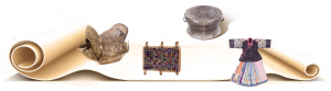 从左到右依次为蒙古族鎏金镂雕龙纹马鞍。汉代织锦“五星出东方利中国”锦护膊。壮族铜鼓。20世纪20年代的苗族女盛装。