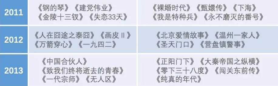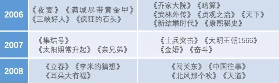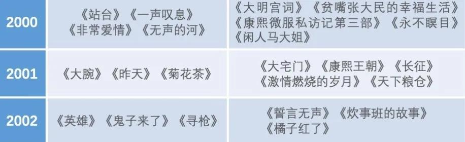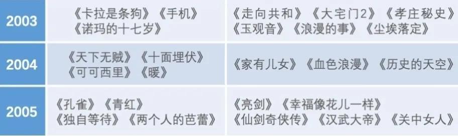在明确中国现代Ⅱ第二波具有流动回溯的现代性这一特质以及影视艺术在人生情境体验营造上的美学特长的交叉点上,可以更清晰地观察21世纪初中国影视潮的状况。从下列表格的简要列举,可以对这二十年中国影视潮中的部分作品作一次匆匆浏览:
