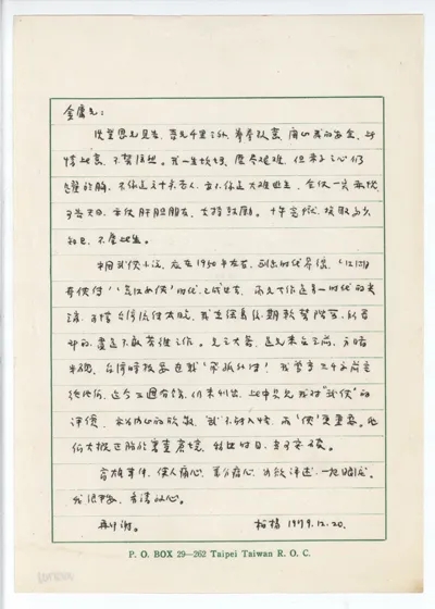 孙观汉是著名的科学家。柏杨被判刑后,孙观汉四处奔走,展开大力营救。在此信中柏杨、张香华向孙观汉说明没有写信的原因:修改校对几部稿子,忙得不可开交。孙观汉来台却不告知日期,怕给朋友添麻烦。