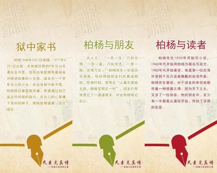 此次展览中国现代文学馆从柏杨先生捐赠的众多书信中精选95封与读者和观众们分享。展览分三部分:“狱中家书”“柏杨与朋友”和“柏杨与读者”,时间跨度从20世纪60年代延续到21世纪。在这些记录日常生活的文字中,不仅饱含着父女亲情和赤诚相待的友情,也闪烁着困境中人性的微光。