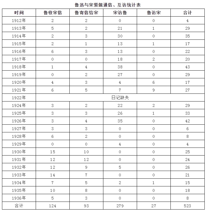 在鲁迅的朋友中,有两位可以称得上是终生挚友,一位是许寿裳,另一位是宋紫佩。学界对鲁迅与许寿裳两人关系有持续深入的探讨,但对鲁迅与宋紫佩关系的探讨颇为冷清。作为鲁迅的同乡,宋紫佩曾经是鲁迅的学生,后来又与鲁迅成为同事和挚友。从1909年相识到1936年鲁迅去世,两人的联系一直未曾间断,鲁迅在杭州、绍兴、北京、厦门、广州、上海时均与宋紫佩保持联系。即使在鲁迅去世以后,宋紫佩与鲁迅亲友之间也依然保持着联系。据笔者统计,鲁迅现存的日记(因鲁迅1922年日记缺失)中提及宋紫佩的次数多达599次(鲁迅亲友的回忆中也多次提到宋紫佩)。从1912年至1936年间,宋紫佩写给鲁迅信121封,鲁迅写给宋紫佩信81封。宋紫佩拜访鲁迅280次,鲁迅拜访宋紫佩27次。具体可见下表: