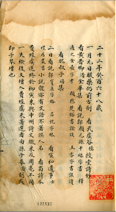 在近代史所藏档案文献中,晚清民国时期的人物日记格外引人注目。据初步统计,馆藏稿本、钞本日记约110种,其中大部分是稿本。每种日记篇幅、数量差异很大,有前后延续一二十年到四五十年者,也有残篇断简,叙事仅有一年半载乃至数月者;一些零星的稿本日记不仅记述时间短,而且属于小人物的日记,撰者很难考订,馆藏多以“佚名日记”著录。