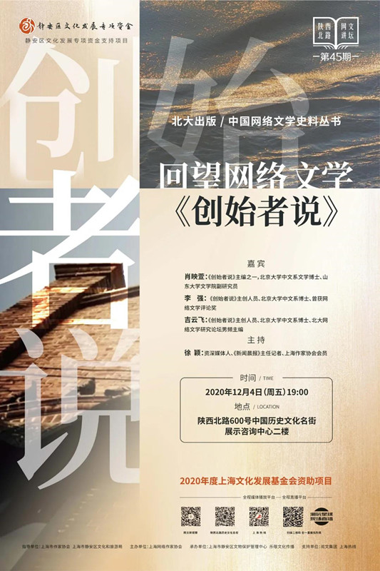 第45期陕西北路网文讲坛特邀《创始者说》主创团队的北京大学中文系博士肖映萱、李强、吉云飞,特邀资深媒体人徐颖主持,对二十多年迅猛发展的网络文学的源头景象做一番回顾和剖析。