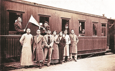历史系同学去山西参观途中,左一为夏鼐,右四为郭秀莹,右三为许亚芬