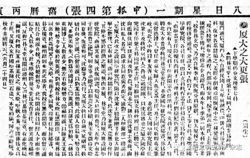 厦门通信:厦门大学自经民国十三年风潮后,即并八科为文理两科,复分各系隶属之。盖经重创后,徐俟恢复中之一种从权办法也。现该校历两年之过程,内部渐臻安固,校主陈嘉庚氏去年南洋树胶营业获利,增拨基金及经费,而本年上季第一届本科毕业,校长林文庆乃决自秋季始恢复分科原状,为大规模之扩充。经校务会通过,分设文、理、教育、商、法、医、工等七科,并增设国学研究院。各科主任,即以文科教育系主任孙贵定为教育科主任,商学系主任陈灿为商科主任,理科主任刘树杞仍旧,医、工两科亦内定有人。现文科主任黄开宗改任法科,惟文科主任无人,特聘北大方音学教授林玉堂充任,并兼国学研究院总秘书。林为留美留德博士,曾任北京女师大英文系主任,及主《国民新报》英文笔政,与北大中教授多友善。林受聘后,并荐北大国学研究院主任沈兼士及教授周树人(鲁迅)、顾颉刚,以沈为将来之厦大国学研究院主任兼文科国学系主任,周、顾则为文科教授,经已聘定。林尚荐孙伏园、钱玄同及刘半农,催尚未定。孙须俟沈兼士来后,由沈以私人名义征求其同意与否而定,钱、刘二人则拟择一聘请云。至厦大此次之设国学研究院,闻以沈兼士、顾颉刚等在北大对国学之整理已有成绩,而该校绌于经费,致沈等著书,竟无力付梓,其他亦感于经济之压迫,无由进展。林玉堂乃以厦大将设国学研究院商请其来厦,沈复函谓苟厦大于开办费外,五年内有若干经常费之把握,则余等必能予以相当之成绩。林玉堂征得文庆同意后,复书报可,沈、顾等乃决行。(下略)(六月二十四日)