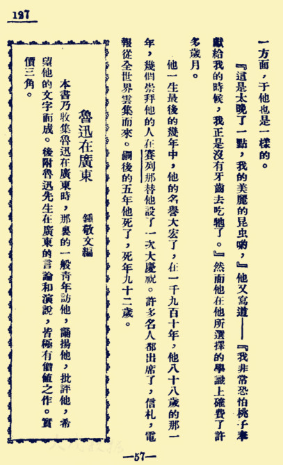 这样一来,就只剩了别人所编的别人的文章,我当然心安理得,无话可说了。但是,还有一层,看了《鲁迅在广东》,是不足以很知道鲁迅之在广东的。我想,要后面再加上几十页白纸,才可以称为“鲁迅在广东”。