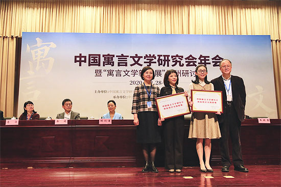 中国寓言文学研究会会长孙建江(右一)、副会长肖惊鸿(左一)为温州瓯海区外国语学校、瓯海区第六幼儿园授予“中国寓言文学研究会教育教学实验基地”。(主办单位供图)