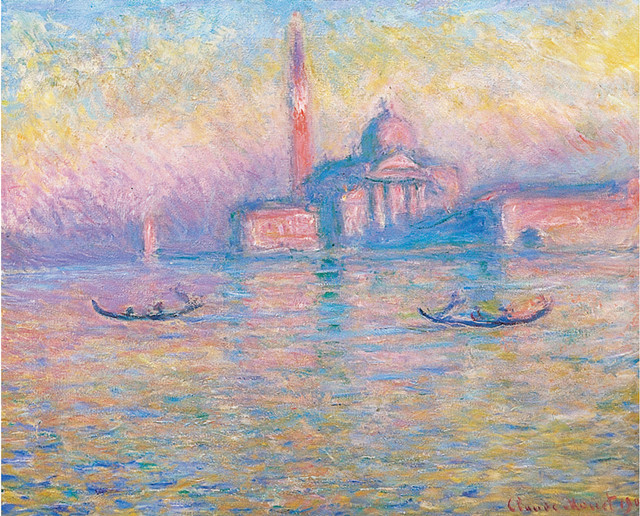 “威尼斯美景”这一部分,也许是在画面与文字的相得益彰上,最让我印象深刻的。因为,一提到莫奈的城市景观题材的系列画作,我们首先想到的是《鲁昂大教堂》或《伦敦议会大厦》,当然,它们是当仁不让的名作。可是,也许是因为它们太著名了,反而掩盖了对其他佳作的欣赏和理解——威尼斯便是一例。作者鲜明地写到,“在莫奈展开创作的所有城市中,威尼斯于他而言,算得上是危险的,因为他完全不想掉入这座古老城邦常有的轶事风格与情绪主义的陈词滥调当中”;就着那美轮美奂的图画,他继续写道,“通过对光线的巧妙运用,为创作对象蒙上一层虚无缥缈的面纱,赋予现实场景以触不可及的梦幻质感”。为了说明莫奈在威尼斯的创作过程,作者还引用了见证者艾丽丝的记录,让我们更加贴近了艺术家作画的那个瞬间。《圣乔治·马焦雷岛》《达里奥宫》……这些之前被忽视的画作在你的面前绽放了光彩,它们似乎用颤动的光影、潋滟的波纹、闪烁的色彩,讲述着既稍纵即逝又永恒绵延的美。