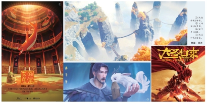 ①《大鱼海棠》海报。② 《原神》场景图。③《姜子牙》海报。④《大圣归来》海报。 制图:李洁