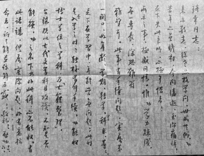与王先生的其他四位弟子相比,我的专业稍微有些不同。作为国务院学位委员会学科评审小组的第一、二届成员,王元化先生招收博士生的专业是中国文学批评史,也就是一般所说的古代文论——注重理论研究。但是我的硕士专业却是古籍整理(版本目录、校勘、训诂小学),注重文本解释。实际上,1986年我被录取的博士专业为古籍整理,导师是华东师大古籍研究所所长徐震堮教授。但不巧的是,徐先生在我刚入学的时候就去世了。那是1986年的10月,于是我就面临着转导师的问题。我在读硕士研究生之前是《汉语大词典》编辑,从罗君惕(上海师大文字学教授)学习《说文解字》、训诂小学。我写信跟相近专业的北京师范大学古典文献学(古籍整理)专业博士导师启功先生联系,希望转到他门下攻读。启功先生很快就给我回了信,这封信是用毛笔写的,我至今还珍藏着: