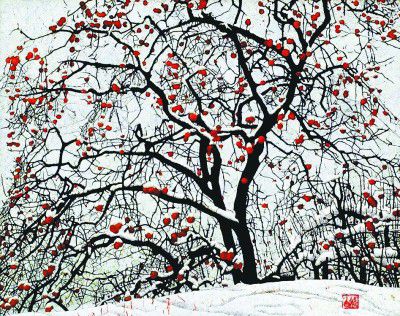 白斌的《静雪润红》极富个人特色,画面造型语言单纯,具象的图形被提炼出点线面的构成形式,色彩洗练,黑白之间用红色点缀,给人以强烈的视觉冲击力。细看画面的背景空间,作者大胆地用鸭蛋壳平铺形成冷白色调,树杈上的积雪和前景则用纯白的鸡蛋壳镶嵌,形成了丰富的空间层次。
