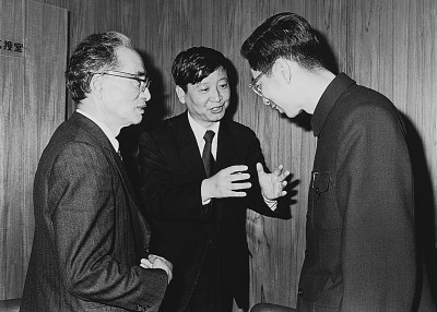 1976年秋天,增田涉(左)与鲁迅之子周海婴(右)在日本仙台会面,中间系本文作者,在为两人当翻译