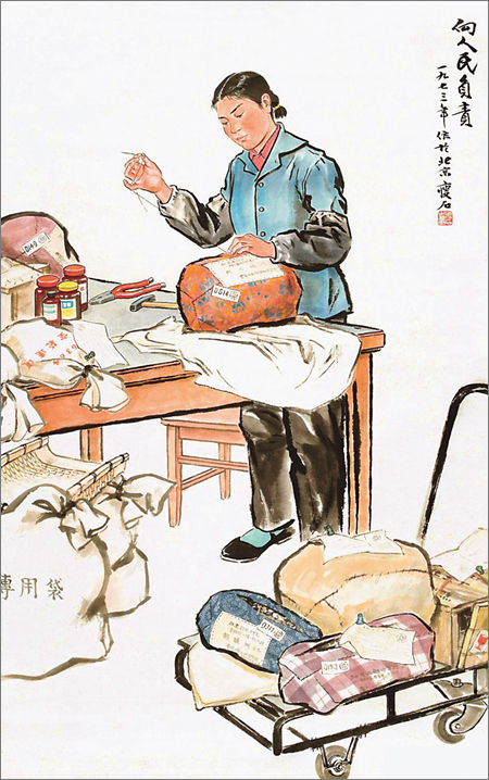抚今追昔,当再次面对着父亲当年创作的这幅表现邮政工人的绘画,特别是父亲题写在画上的“向人民负责”五个字时,使我更加意味深长地体会到了父亲当时的心境。