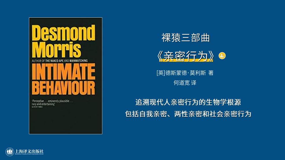 今年全新亮相的社科新书系“译文科学”将推出英国著名动物学家、生物人类学家德斯蒙德·莫利斯畅销全球2000余万册的经典之作“裸猿三部曲”。莫利斯以严谨的科学态度和贯穿一生的观察研究,通过《裸猿》《人类动物园》《亲密行为》三部作品向人类宣称:人,不是从天而降的天使,而是由地而生的猿猴。