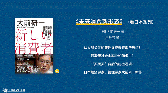 日本观察方面,日本经济学家、管理学家大前研一的又一日本观察力作《未来消费新形态》将于今年与读者见面。作为《低欲望社会》的姊妹篇,大前研一在该书中基于敏锐的社会透视,提出日本“低欲望社会”形势下的新经济对策。他提出了“不能善用网络的商家将退出历史舞台”,分析了经济形势下出现的新问题:急速增长的共享经济、偶像经济、从物品消费向体验消费的转变等。