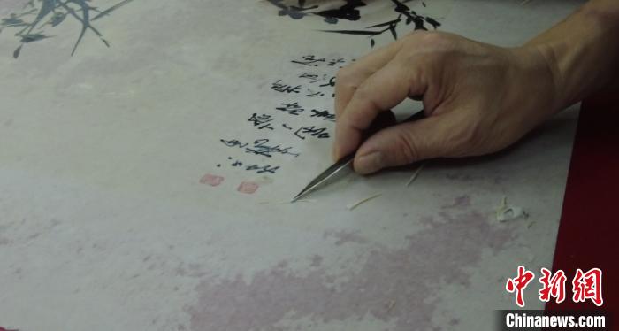 中新网记者见到吴福明时,他正站在操作台前修复一幅近代的书画。用水浸湿书画仔细刷洗后,吴福明用镊子仔细将覆在画心上的命纸小心揭下,这两个过程称之为“洗画”和“揭裱”。“修复古画本身就是一件细致的事情,需要细心和耐心,慢工才能出细活。”他说。