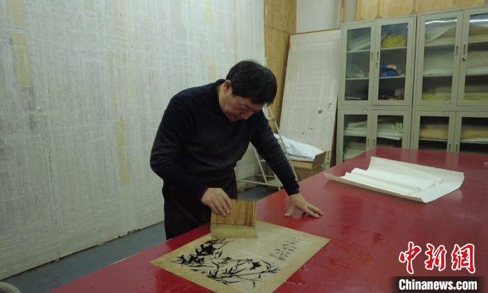 吴福明正在对一幅近代的书画进行揭裱。 李韵涵 摄
