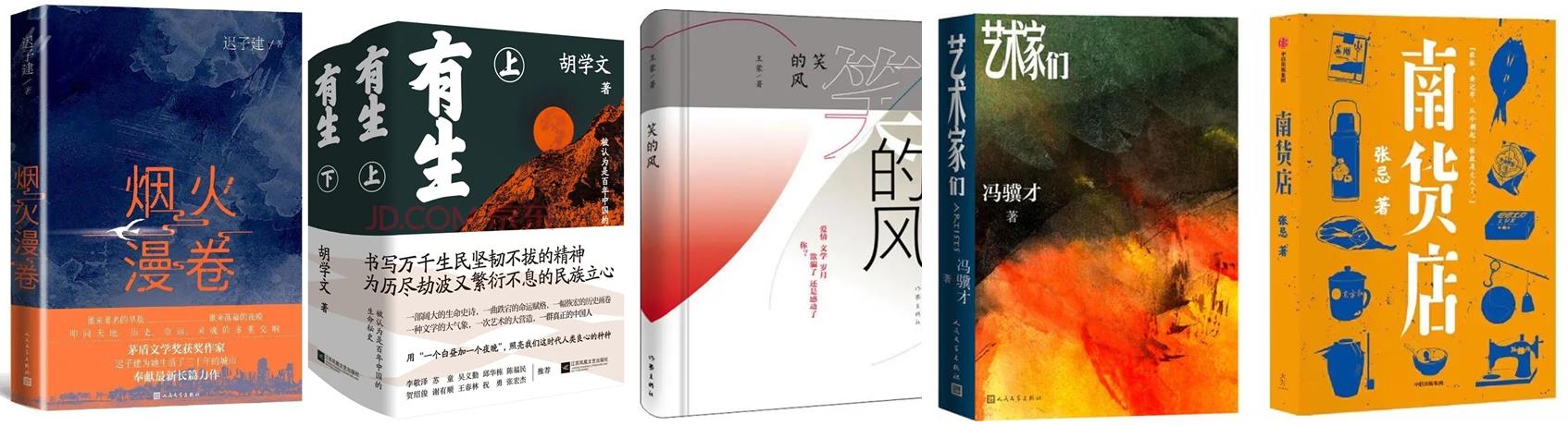 从左到右:迟子建《烟火漫卷》、胡学文《有生》、王蒙《笑的风》、冯骥才《艺术家们》、张忌《南货店》